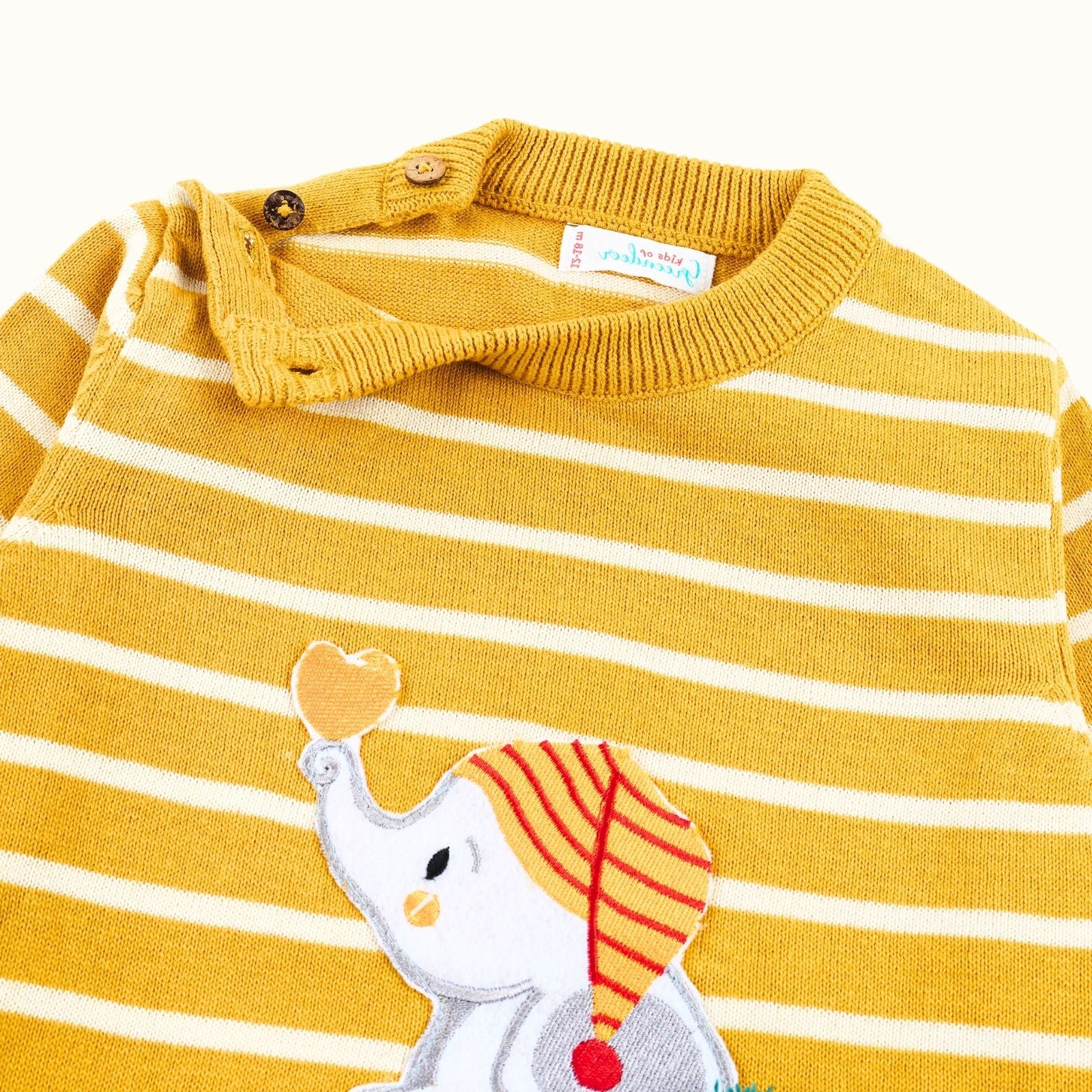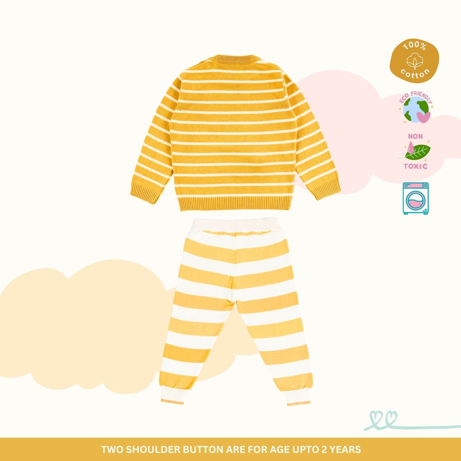 Our signature sweater and lower set features a roomier body-fit, ensuring ease of wear for babies. Crafted from 100% natural and non-toxic materials, it prioritizes their safety and well-being. The signature diaper lowers are designed with a low crotch and soft rib with a drawstring, allowing for a roomier and comfortable fit, enabling free movement.