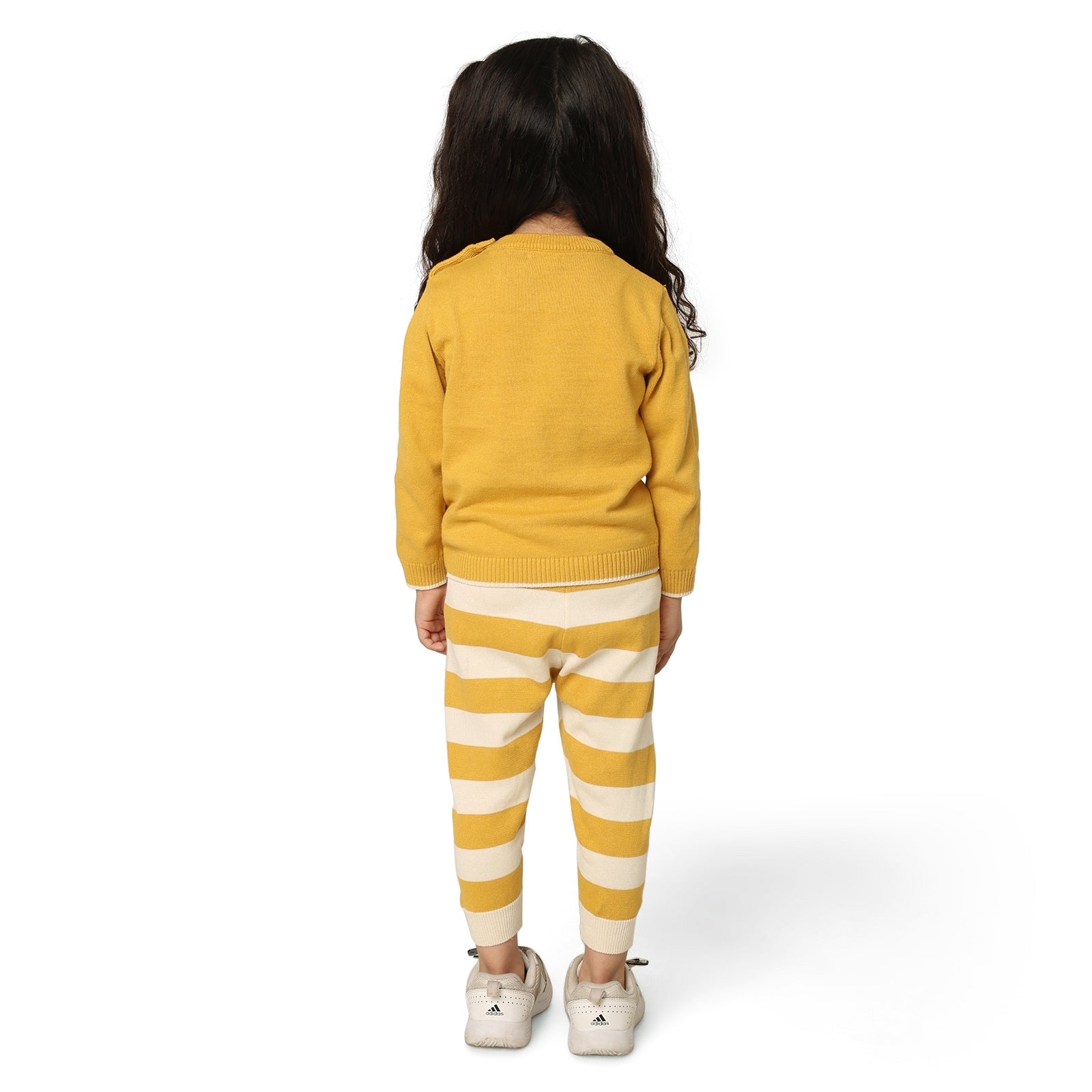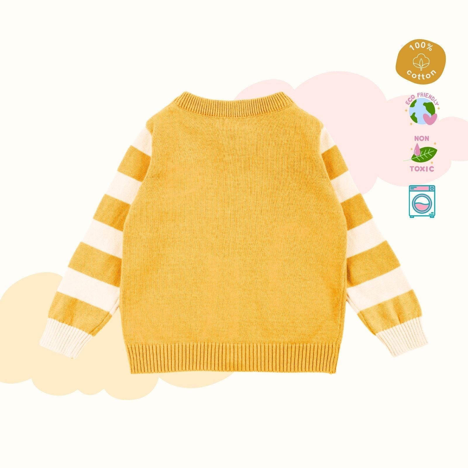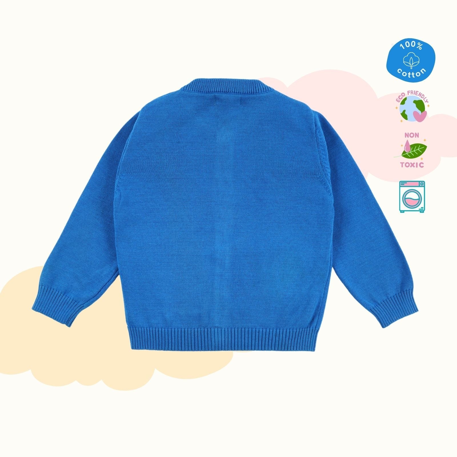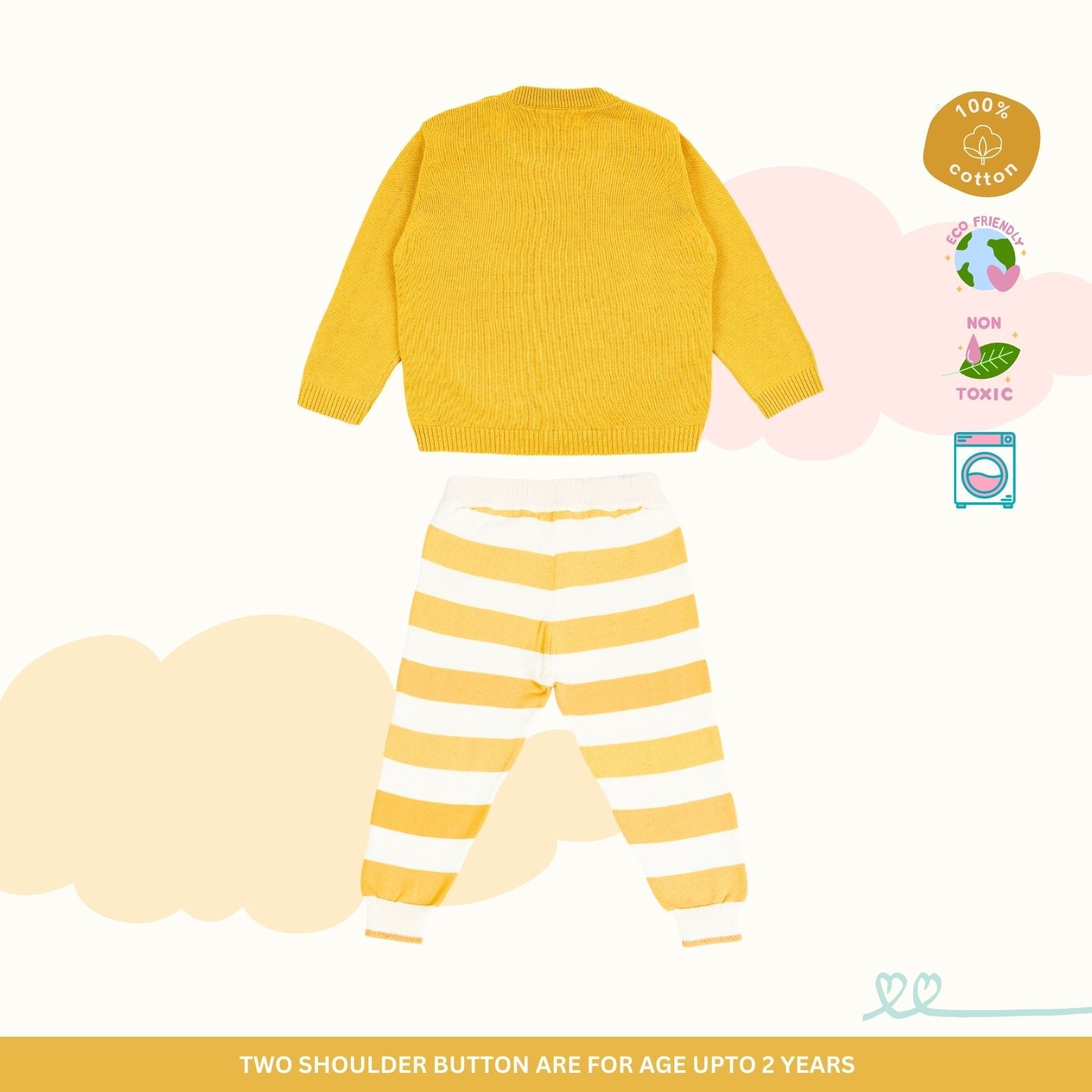 Our signature sweater and lower set features a roomier body-fit, ensuring ease of wear for babies. Crafted from 100% natural and non-toxic materials, it prioritizes their safety and well-being. The signature diaper lowers are designed with a low crotch and soft rib with a drawstring, allowing for a roomier and comfortable fit, enabling free movement.