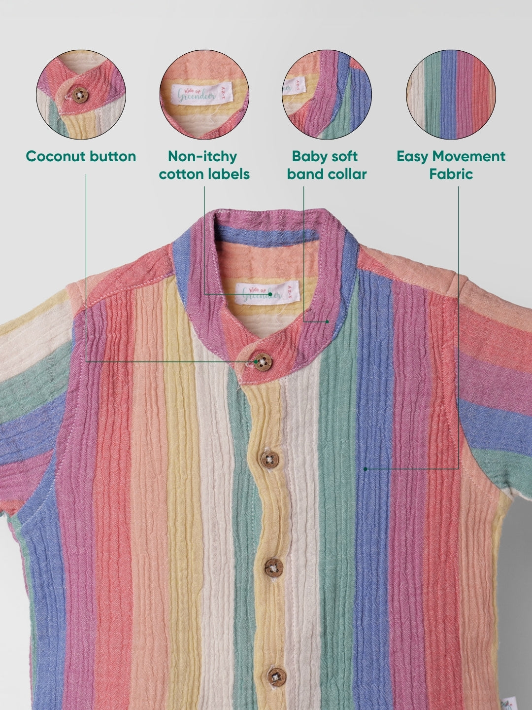 Shirt: Yarn-dyed rainbow stripes, coconut buttons, non-itchy labels