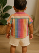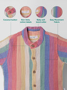 Brighten up your little one’s wardrobe with this unisex co-ord set featuring a rainbow-striped shirt and soft cream shorts. Crafted from 100% eco cotton, this outfit is softener-washed, breathable, and perfect for sensitive baby skin. The shirt features a comfy band collar, coconut shell buttons, and vibrant yarn-dyed stripes for a playful look. Paired with lightweight muslin shorts featuring an elasticated drawstring waistband and a patch pocket at the back, this summer set is designed for all-day comfort and movement.