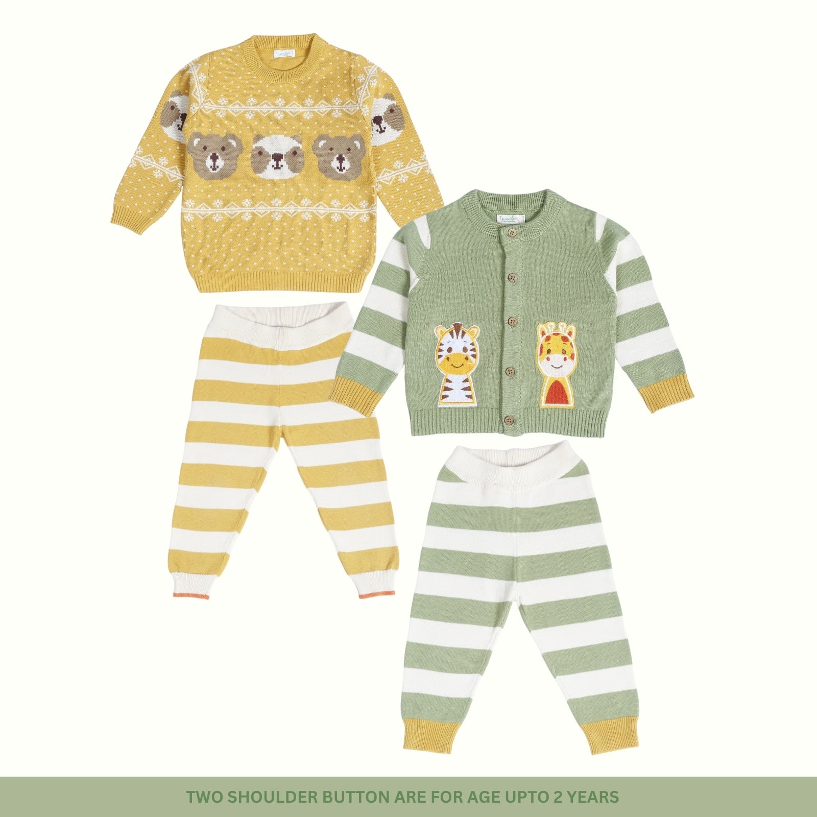 Our signature sweater and lower set features a roomier body-fit, ensuring ease of wear for babies. Crafted from 100% natural and non-toxic materials, it prioritizes their safety and well-being. The signature diaper lowers are designed with a low crotch and soft rib with a drawstring, allowing for a roomier and comfortable fit, enabling free movement.