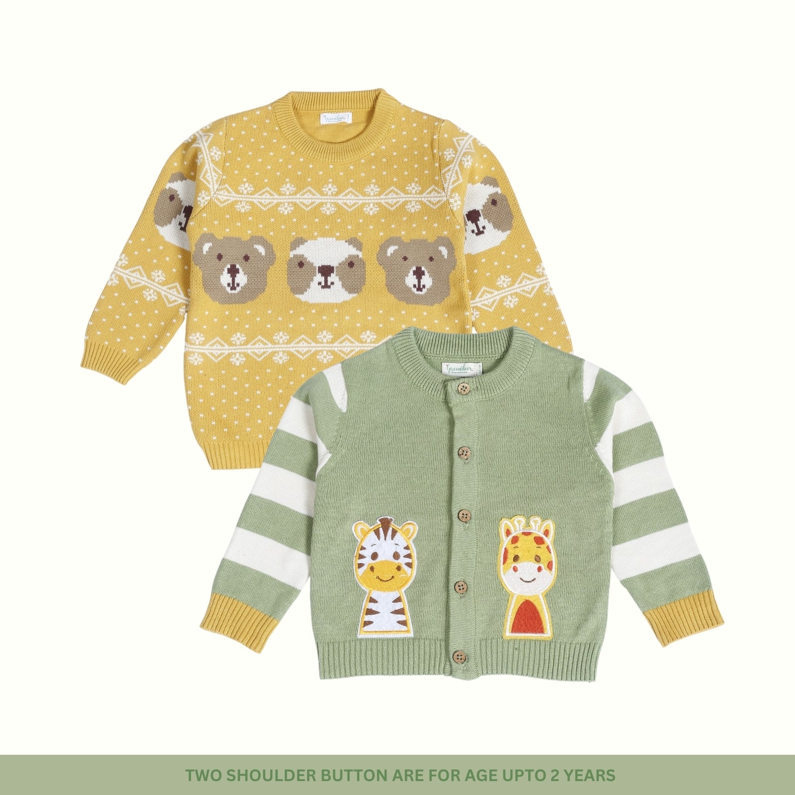Our signature sweater and lower set features a roomier body-fit, ensuring ease of wear for babies. Crafted from 100% natural and non-toxic materials, it prioritizes their safety and well-being. The signature diaper lowers are designed with a low crotch and soft rib with a drawstring, allowing for a roomier and comfortable fit, enabling free movement.