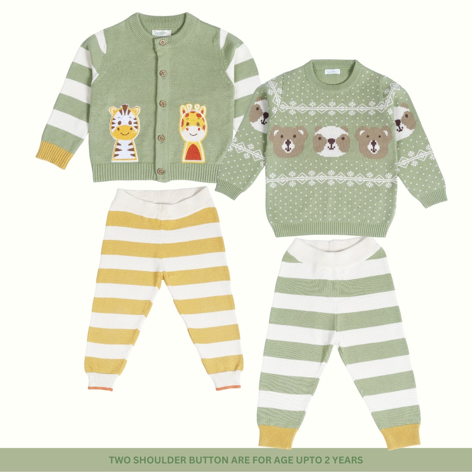 Our signature sweater and lower set features a roomier body-fit, ensuring ease of wear for babies. Crafted from 100% natural and non-toxic materials, it prioritizes their safety and well-being. The signature diaper lowers are designed with a low crotch and soft rib with a drawstring, allowing for a roomier and comfortable fit, enabling free movement.