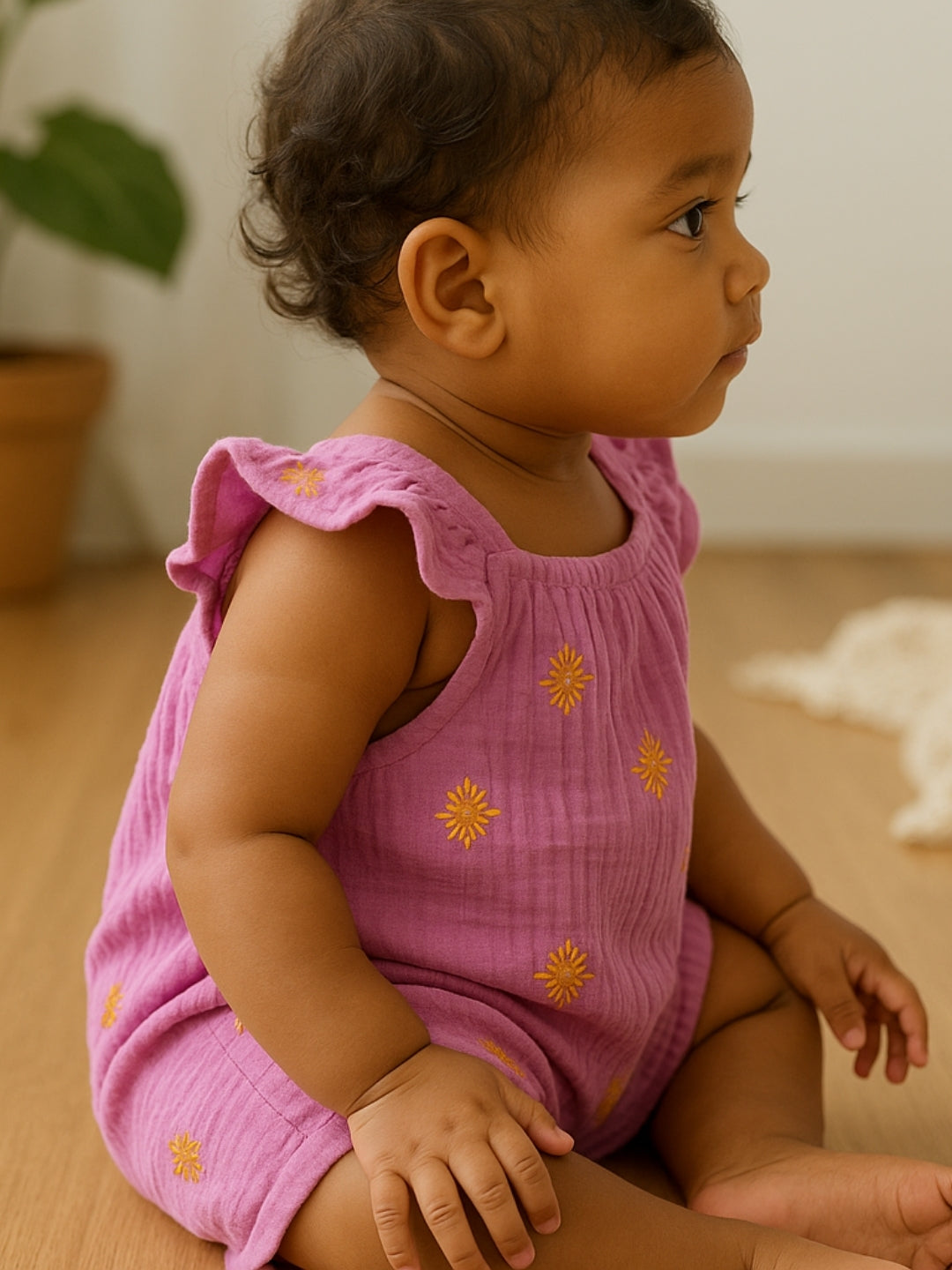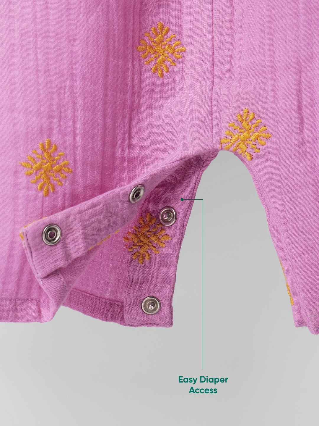 100% Eco Cotton romper featuring self-embroidery technique (subtle orange florals woven into lavender crinkle cotton), it eliminates itching while ensuring fade-proof beauty. The double frill sleeves with soft elastic, expandable chest panel, and full-leg snap buttons deliver effortless diaper changes upto 2 years. Pre-washed for hypoallergenic softness and reinforced at stress points, it’s heirloom quality that withstands playground tests.