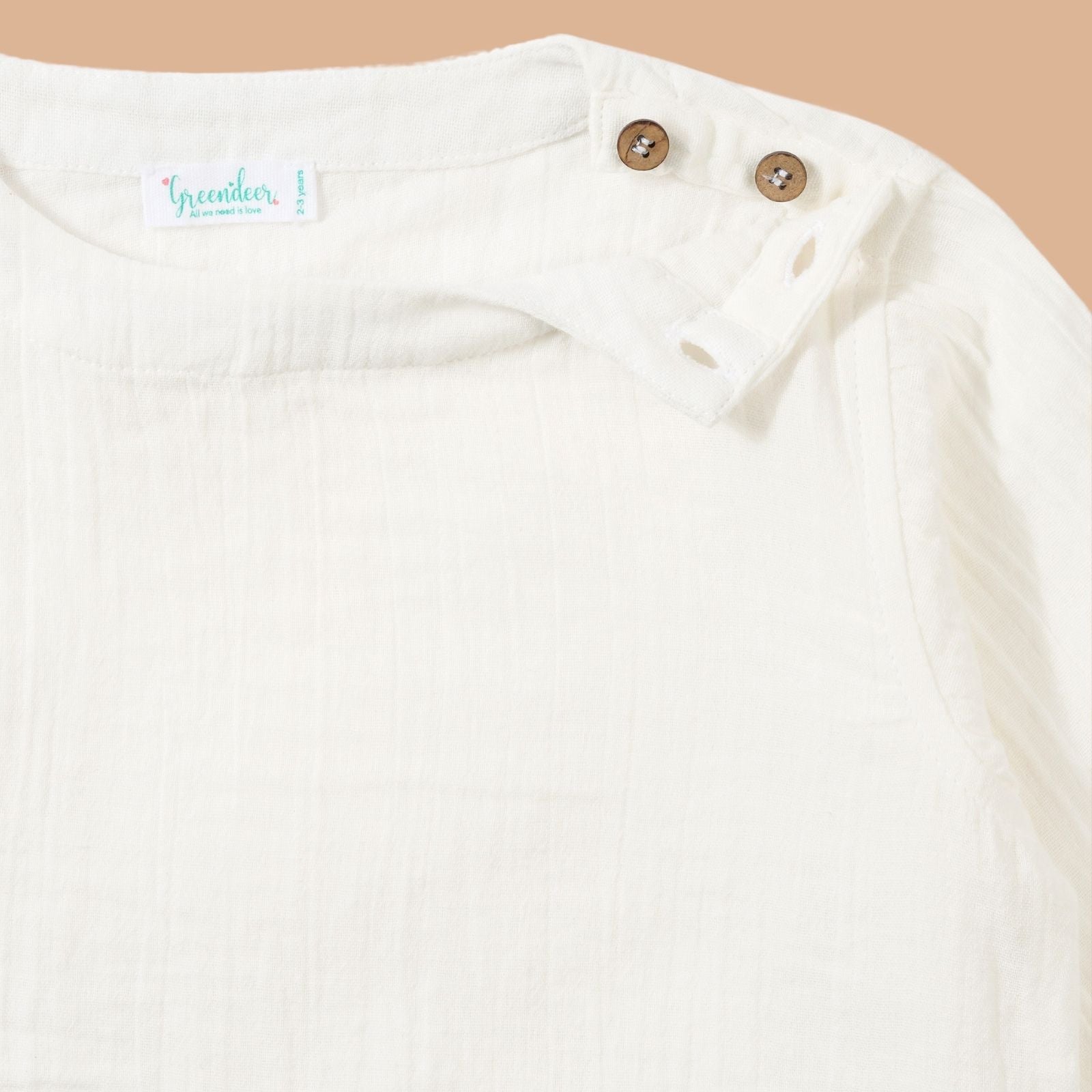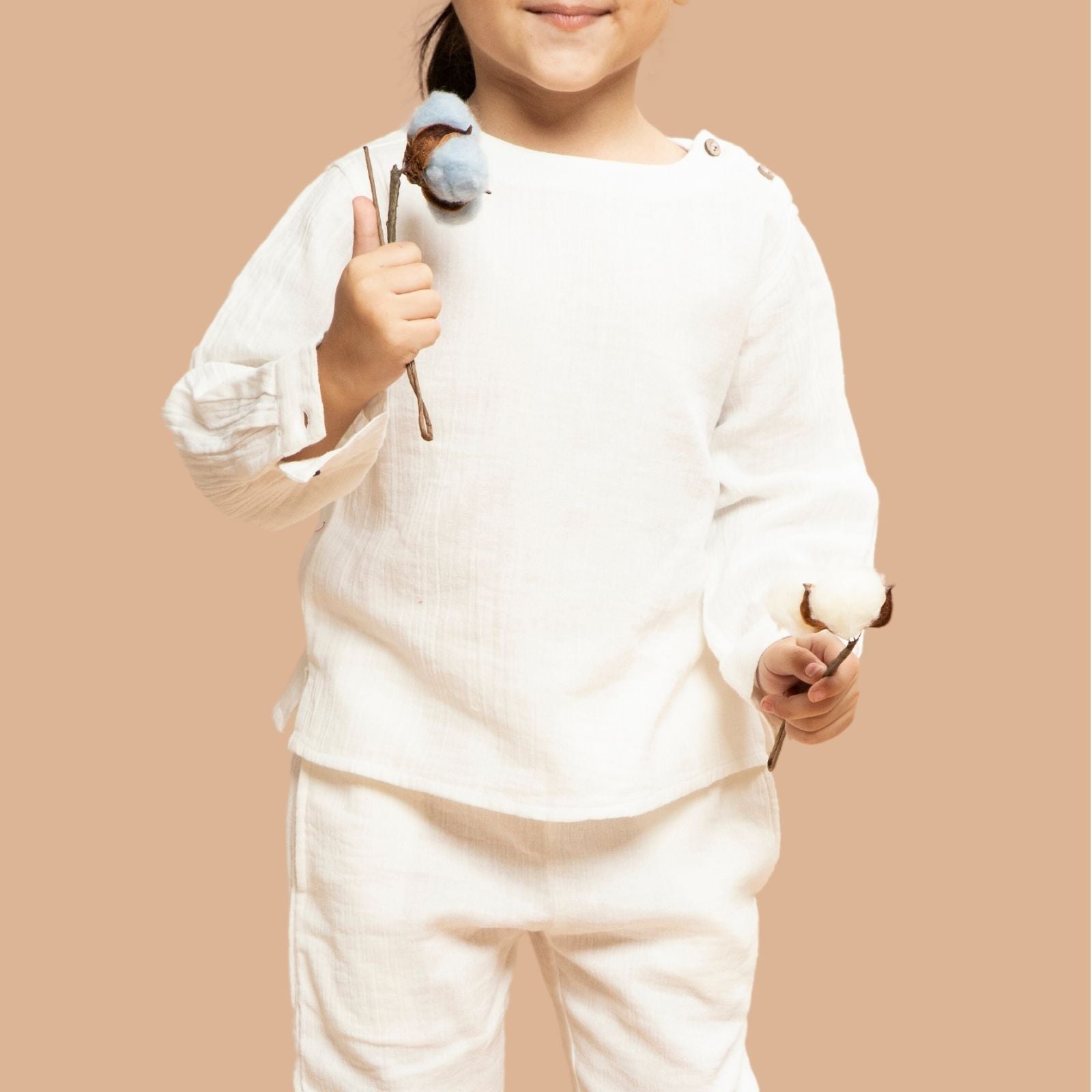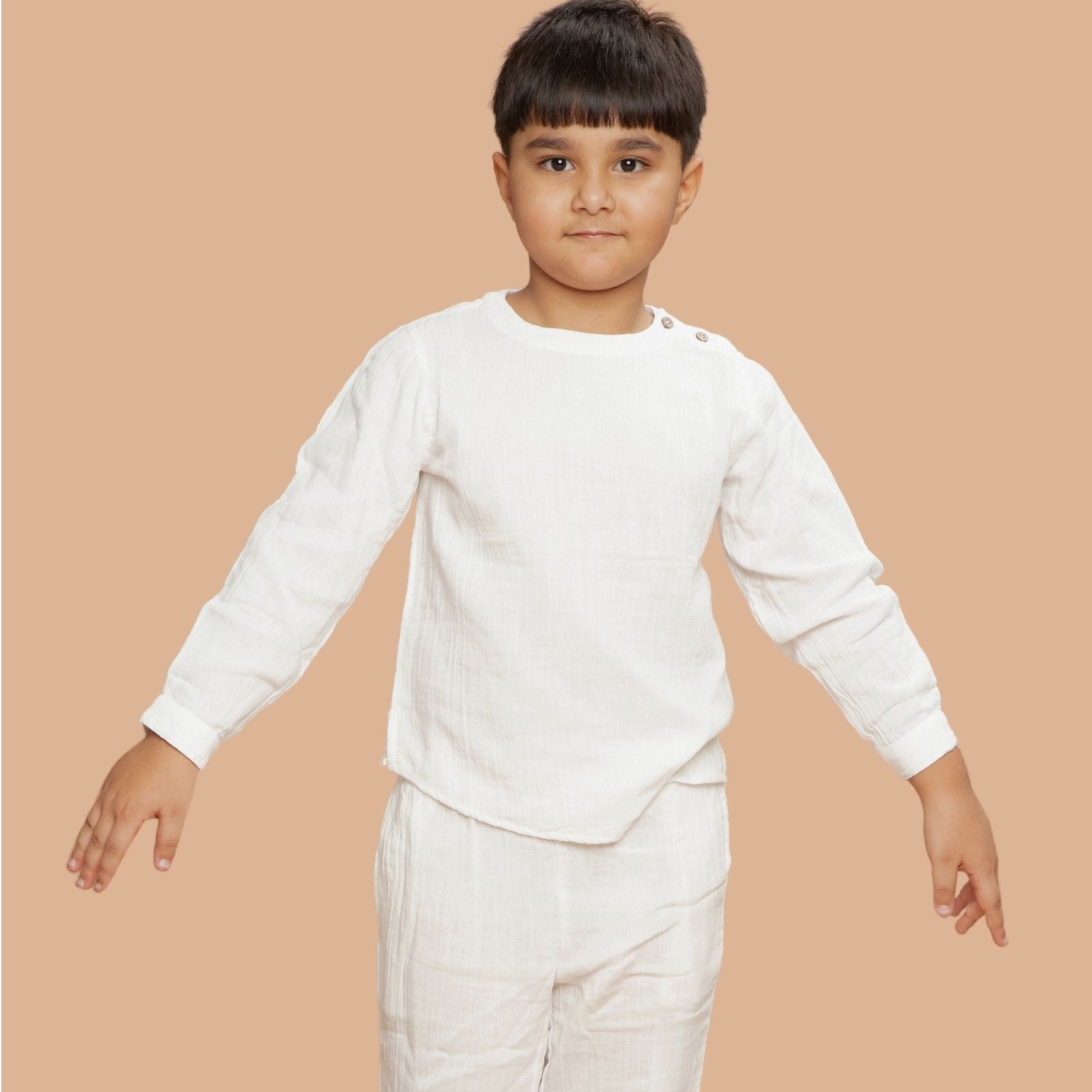 Introducing our modern Shirt Kurta for Kids, designed to elevate their style with comfort and ease. Crafted from 100% crinkled double cotton, this kurta offers a comfortable fit in a soulful white color. The side slits ensure freedom of movement, while the two-button fastening at the shoulder adds a stylish touch and makes it easy to wear. Pre-washed for added softness and effortless care, this shirt kurta is perfect for premium everyday wear. Give your little ones a touch of elegance with this exceptional piece