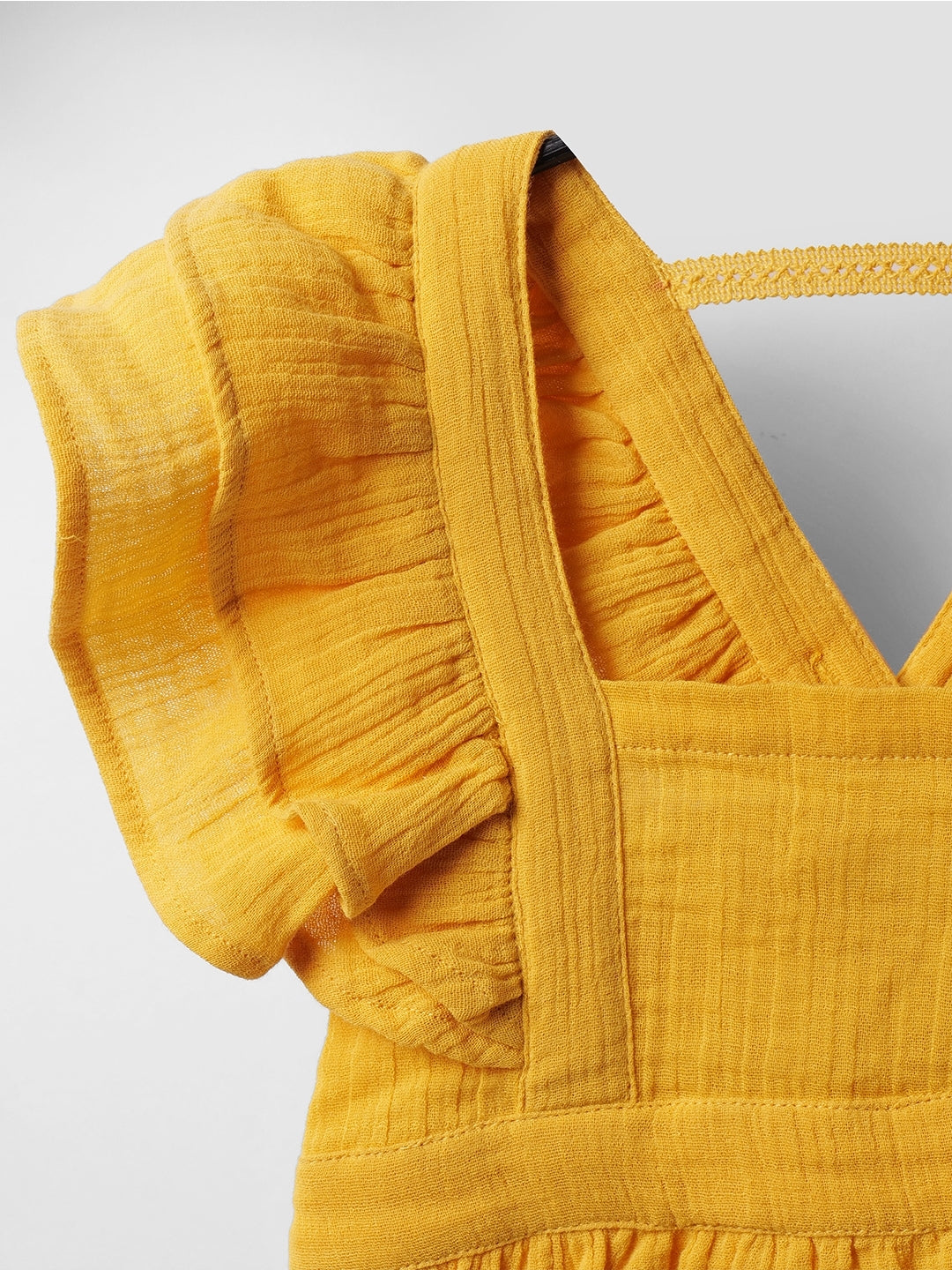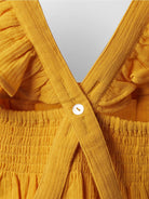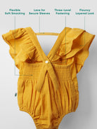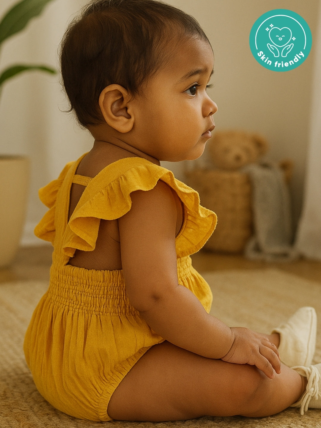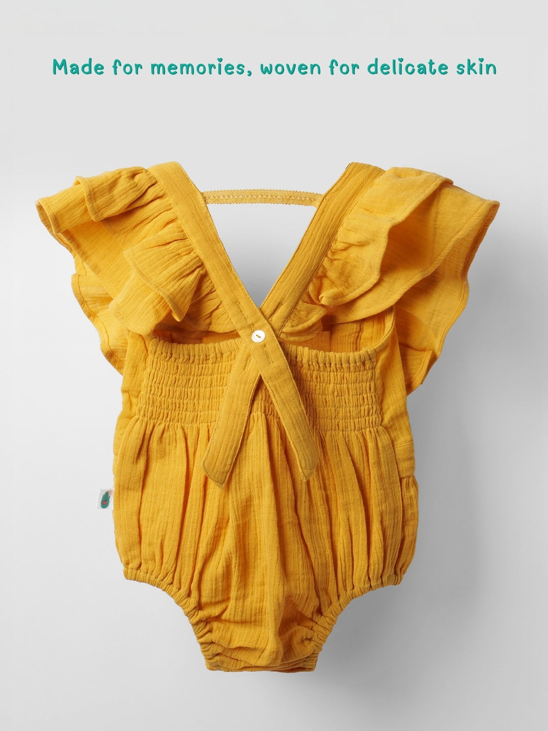 Wrap your little one in ethically crafted comfort with this 0-2Y onesie, made from 100% Eco Cotton and woven for delicate skin. Featuring an adorable subtle yellow onesie, the double crinkle cotton is pre-washed for cloud-like softness and dyed with non-toxic, azo-free colors. Innovative design includes secure back lace to prevent slipping, three-level button fastening for adjustable growth, and flexible smocking that moves with wiggly explorers. Finished with reinforced stitching and flouncy layered detailing, it’s heirloom quality that lasts from newborn cuddles to toddler adventures.