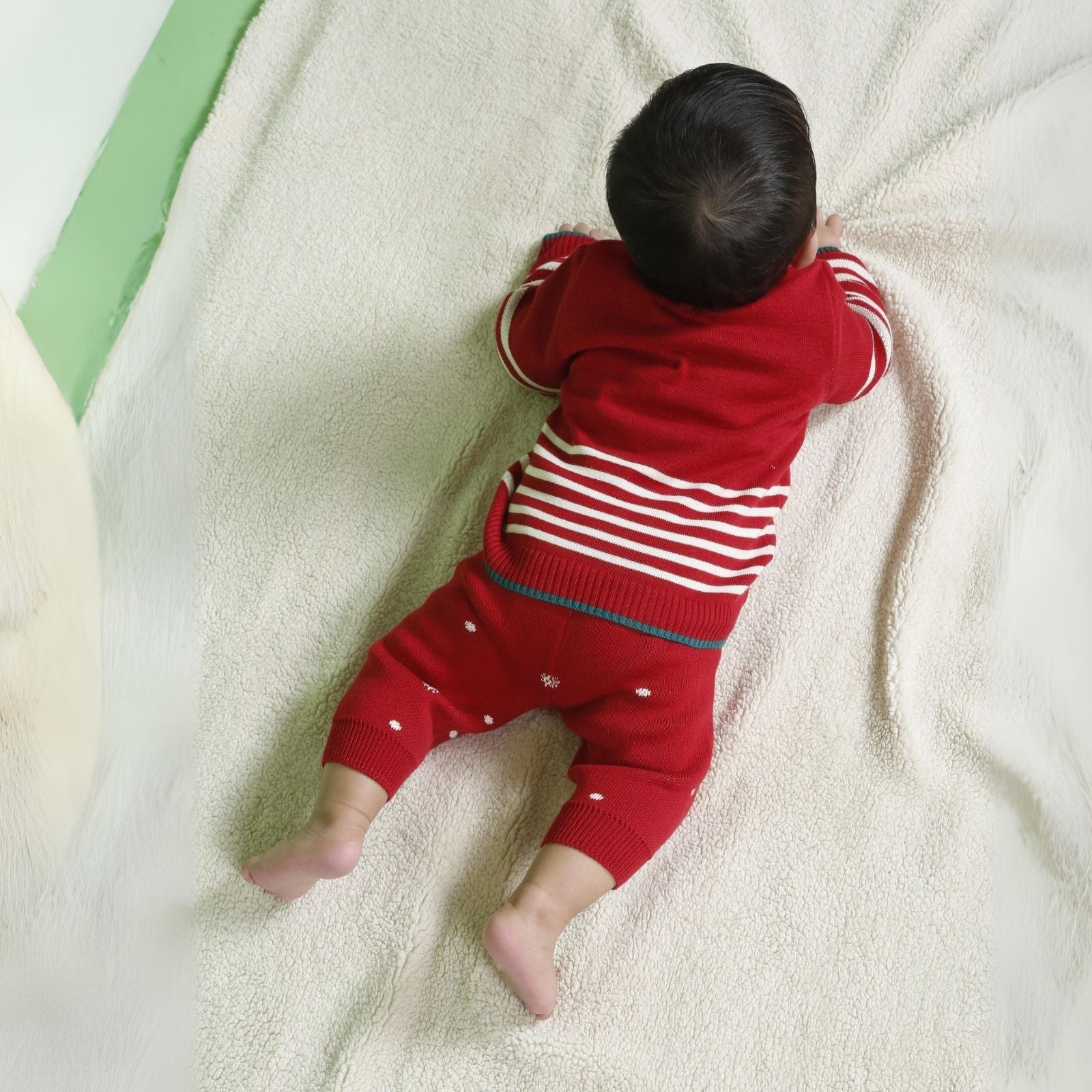 Our signature sweater and lower set features a roomier body-fit, ensuring ease of wear for babies. Crafted from 100% natural and non-toxic materials, it prioritizes their safety and well-being. The signature diaper lowers are designed with a low crotch and soft rib with a drawstring, allowing for a roomier and comfortable fit, enabling free movement.