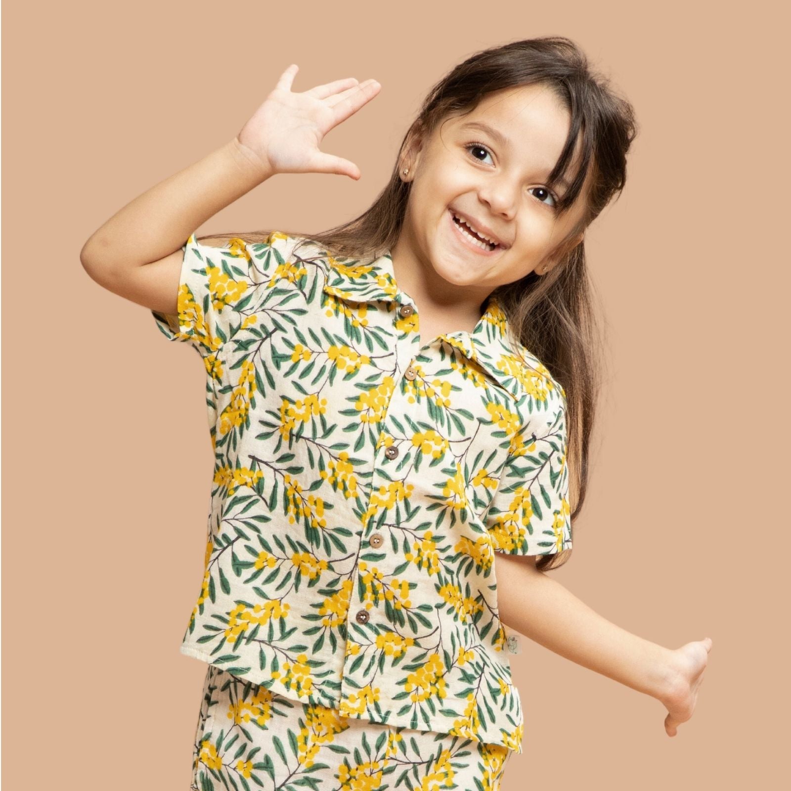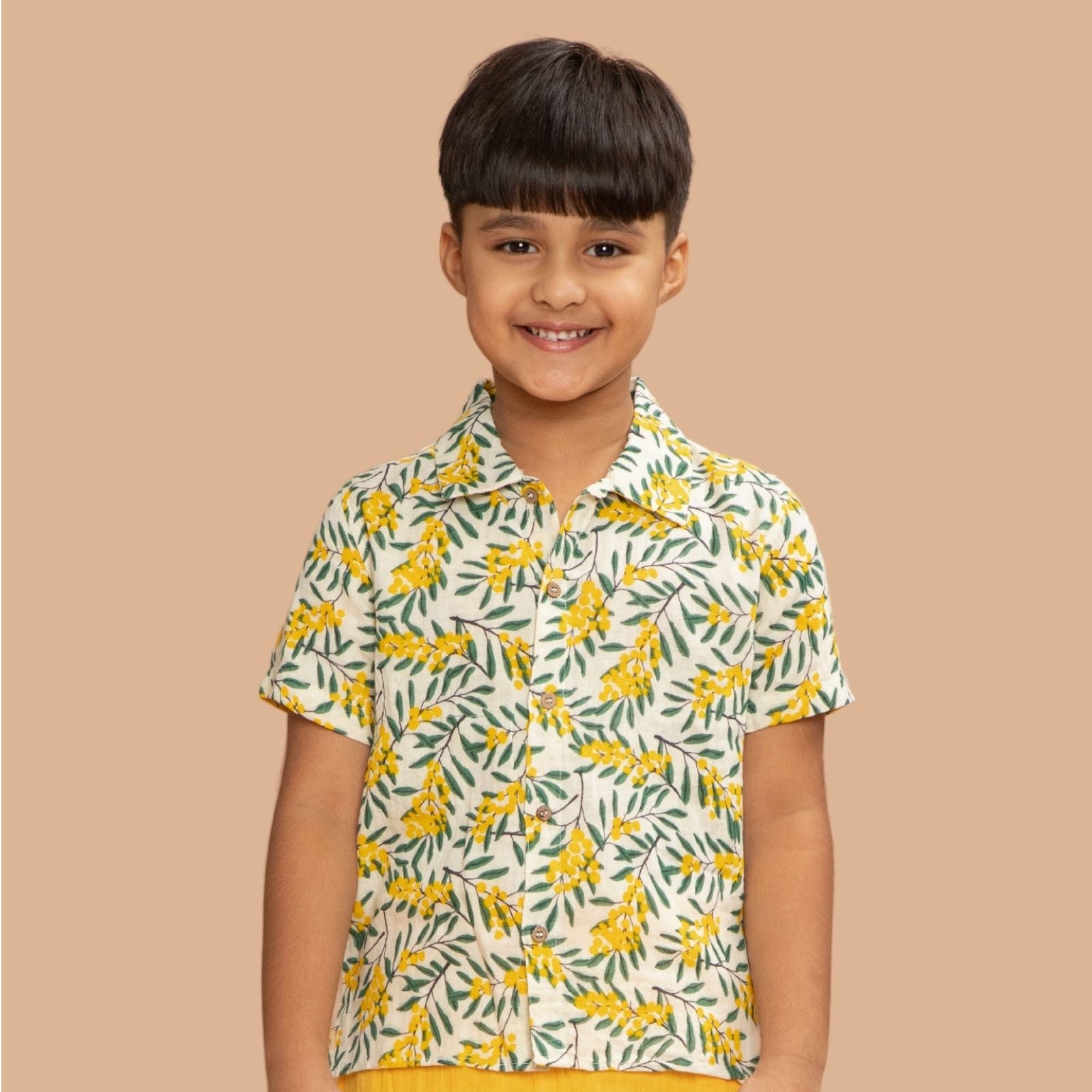 Introducing our Leave Print Relaxed Half Sleeve Shirt for Kids, a perfect blend of comfort and quirkiness. Crafted from 100% double cotton, this shirt offers a comfortable fit for your little ones. The splash of green and yellow colors on a white base in the leave print adds a vibrant and playful touch to their outfit. With side slits for added comfort and freedom of movement, this shirt is designed for premium everyday wear. The two-button fastening at the shoulder adds style and makes it easy to wear. Pre-washed for added softness and easy care, this shirt is the perfect choice for your fashion-forward kids.