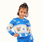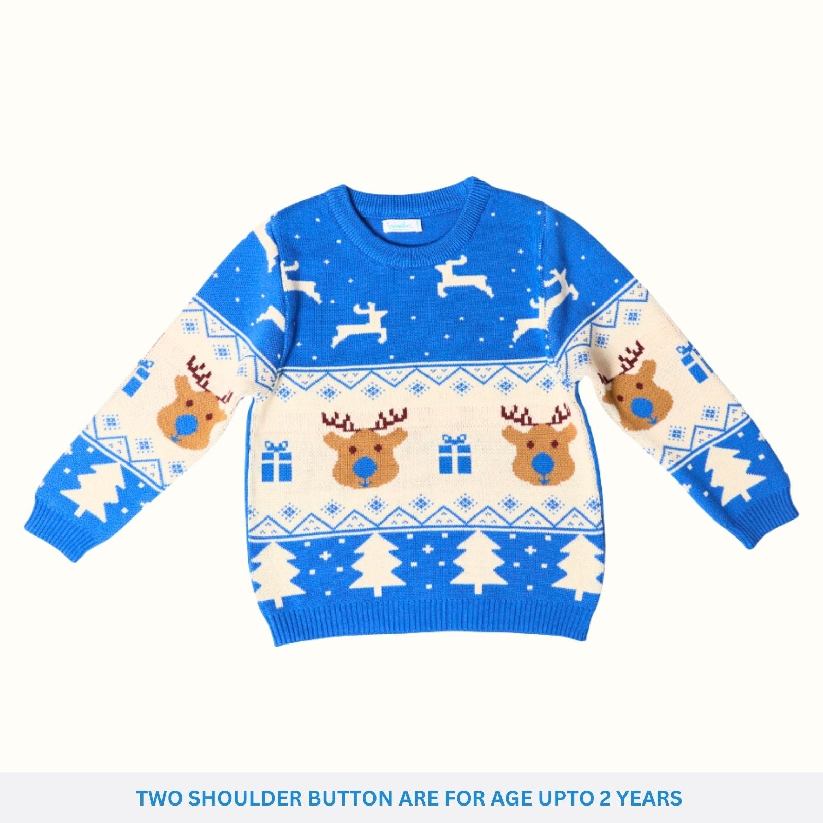 Jaunty Reindeer 100% Cotton Jacquard Sweater - Greek Blue with Lower & Cap Set of 3