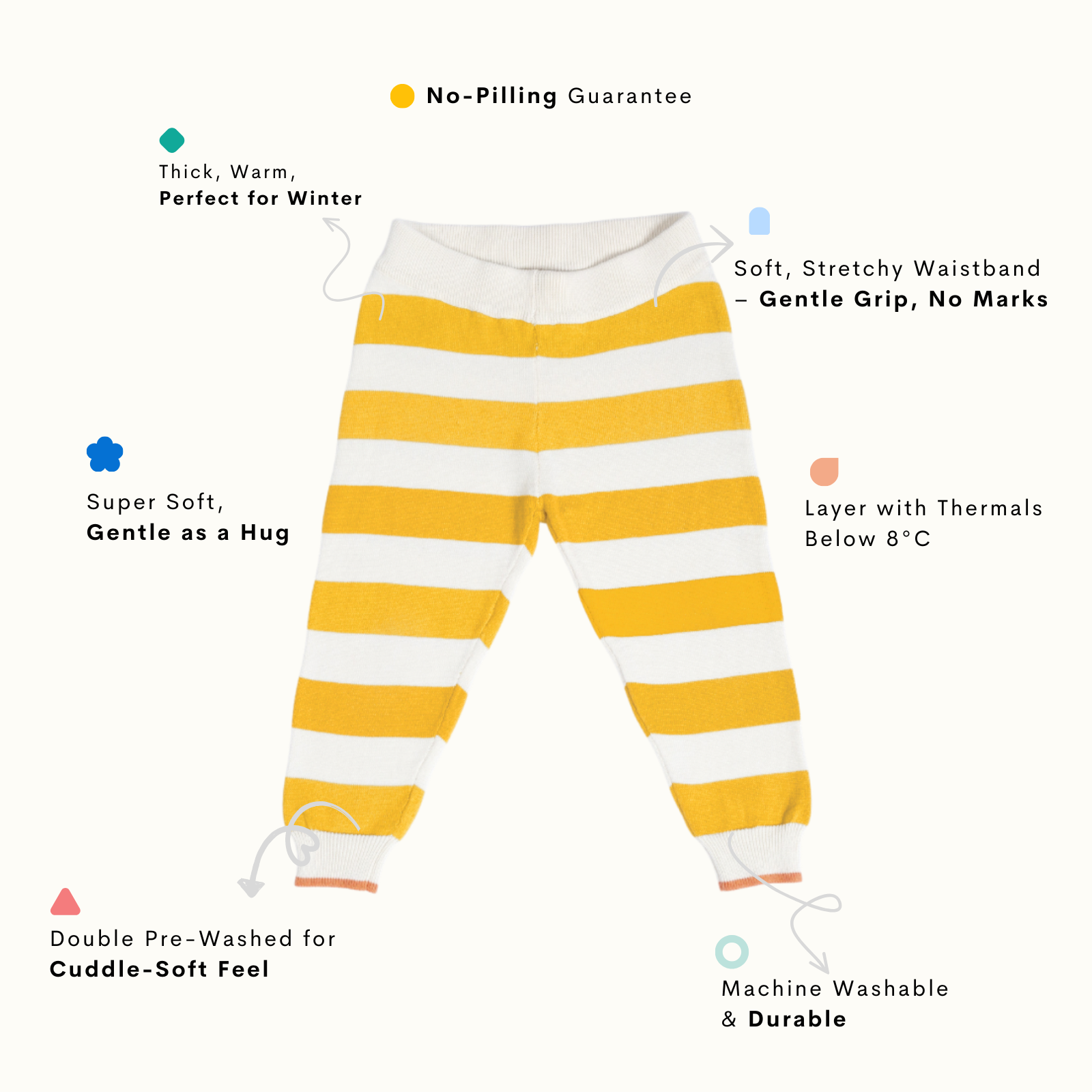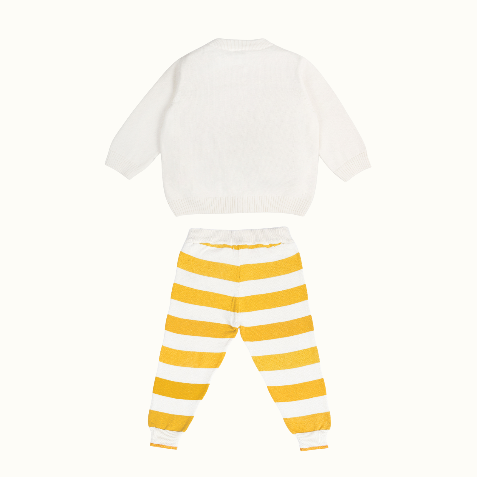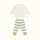 Our signature sweater and lower set features a roomier body-fit, ensuring ease of wear for babies. Crafted from 100% natural and non-toxic materials, it prioritizes their safety and well-being. The signature diaper lowers are designed with a low crotch and soft rib with a drawstring, allowing for a roomier and comfortable fit, enabling free movement.