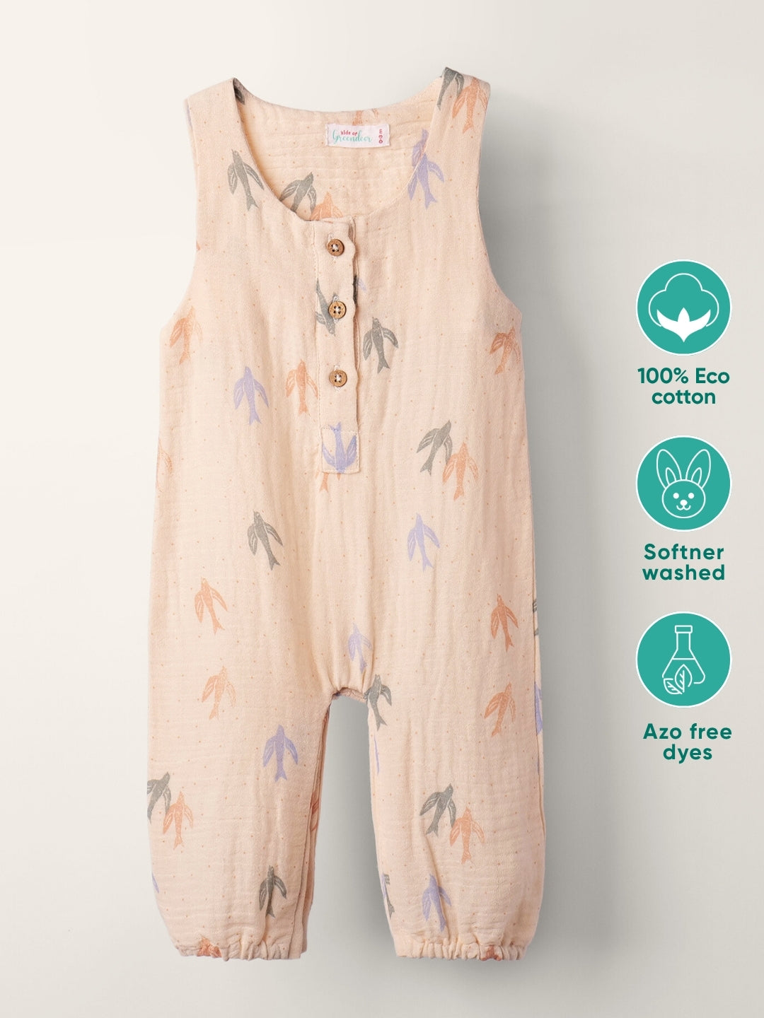 Offers a relaxed, roomy fit designed for babies to move freely. Soft gathers at the legs and button details give it a playful yet polished look.